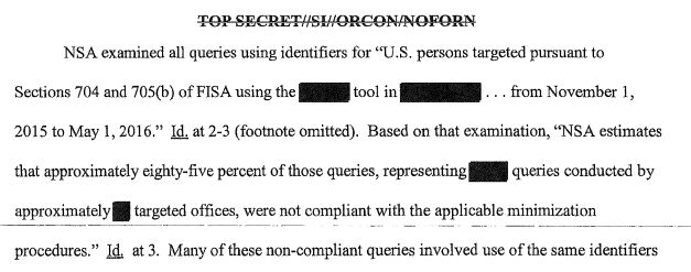 85% of the queries conducted within the NSA database system were not compliant with minimization procedures in a single review from November 2015 to May 2016.