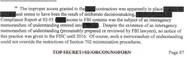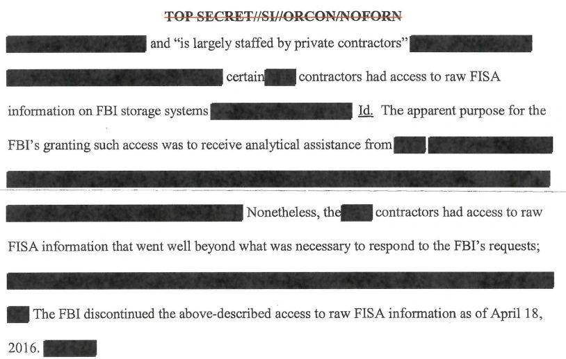 FBI gave contractors access to raw data that went well beyond what was necesarry to support FBI request (Assistance). This practice was stopped April 18, 2016 via Admiral Rogers, Director of NSA.