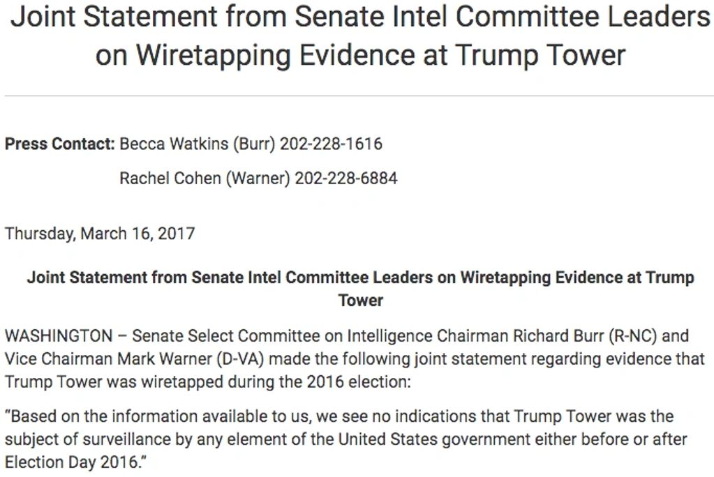 On, March 16, 2017, One day before the 'Potential Sedition Act' (03/17/17), the SSCI Leaders make a joint statement that they have no evidence of a wiretap (A FISA).