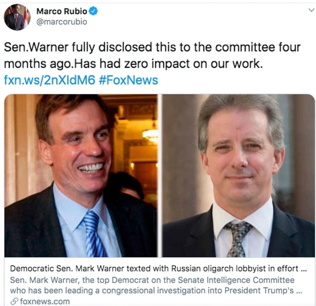 Senator Rubio tweets our support for Senator Warner doing the right thing (releasing text messages showing him communicating with Russians and British spy Christopher Steele via lawyer) -(SEE "Seditious Conspiracy or Hero?" section BELOW)